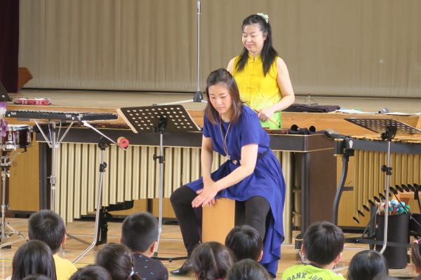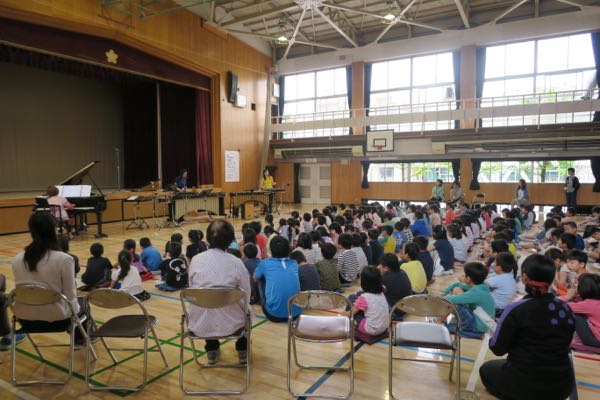 板橋区立志村第三小学校で「ビバ!パーカッション」による音楽鑑賞会が行われました。 体育館のステージの前には様々な打楽器が並び、皆さん興味津々!マリンバを中心とした打楽器のウキウキとした音と、ドンドンとお腹まで響くような振動に身を任せ体を揺らしたりして、終始楽しんで聞いていただきました。 参加コーナーの「子象の行進」という演奏家の方のリズムを真似して手拍子していただくプログラムでは、皆さん簡単なリズムからとても難しいリズムまで軽々とこなされ、リズム感の良さにびっくりしてしまいました。また、子象だけでなく、色々な動物も飛び出しました。様々な楽器や身近な物(例えばホース)などを使い、鳥の鳴き声や牛の声などを表現します。まるで動物園に来たかのよう! 「みんなで歌いましょう」のコーナーではさんぽを「マレット・ガーデン」による伴奏で歌っていただきました。しっかりと3番の歌詞まで覚えていてくださり、元気いっぱいに手を振って足踏みしながら歌っていただきました。体育館いっぱいに広がる大きく楽しそうな歌声に心が幸せな気持ちで満たされました。 お天気にも恵まれ、春の爽やかな風が包み込む素敵な音楽鑑賞会となりました。