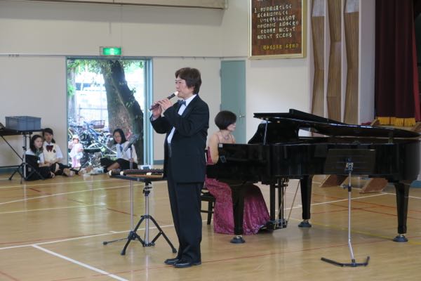 東京都調布市にある若葉小学校で「まほうのふえ」の公演が行われました。 7/18(月)の調布市文化会館たづくりくすのきホールの公演に先駆け、アウトリーチとして行われたコンサートでした。若葉小学校は都内とは思えないほど緑がいっぱいで、まるでトトロの映画の中に入り込んだかのよう!当日は非常に気温が高く、会場となりました体育館は蒸し暑かったのですが、窓に映る緑の風景に心が癒されました。プログラムはウイリアム・テルから始まりました。皆さん一度は手にしたことがある同じリコーダーから、まるで馬が走っているかのような軽快で速い演奏に「こんな音も出るのか!」と前のめりになって聞いてくださいました。また、リコーダーの紹介では手のひらサイズの小さなリコーダーからとっても大きいバスリコーダーまで、6種類のリコーダーを紹介しました。見た目もさることながら、音色の違いにも皆さん驚かれ、新しいリコーダーが現れるたび、会場はどよめいていました。他にもフルートの美しい音色に酔いしれ、ケーナの民族的な音楽に心はアンデスの地へ旅に出ます。みんなで歌いましょうのコーナーでは皆さん気持ちを一つにし、「ふるさと」を歌われました。外で聞いていらっしゃった方々も一緒に歌ってくださり、暑さを弾き飛ばすような爽やかで素敵な歌声が体育館を包み込みました。 最後はお待ちかねのジブリメドレーでした。曲ごとに今日紹介した笛たちが顔を出します。途中で登場したオカリナや鍵盤ハーモニカ、ピッコロの登場にまた魅了され、それぞれのお話の世界観を演出し、皆さんジブリワールドへ誘われていきました。 短いコンサートではありましたが、会場の皆さんと一緒に素敵な時間を共有できました。暖かい地元の方々やスタッフの方々にも恵まれ、お昼にはとっても美味しい手作りの豚汁までご馳走になりました。ありがとうございました。
