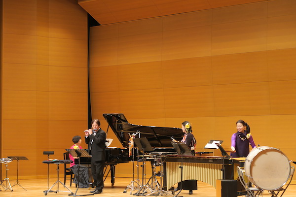 小美玉市生涯学習センター「コスモス」で「ビバ・パーカッション!with笛の音楽隊」の公演がありました。 第一部は「マレットガーデン」による「ビバ・パーカッション!」 フルートの一村誠也も加わり、ハチャトゥリヤンの「剣の舞」でオープニング。 ピアソラのリベルタンゴやティコティコも盛り上がりました。 第二部は、自主活動している「ピッコロ」が3曲発表し、 第三部は4回のリコーダーワークショップと前日リハーサルそして午前中にゲネプロを終えた、 「小美玉笛の音楽隊」の発表。 「パプリカ」は大盛り上がりでした。